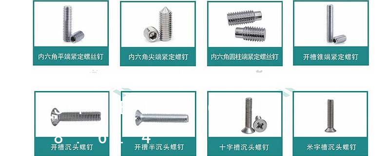 1.機螺釘 2.自攻螺釘 3.鉆尾螺釘 4.墻板釘 5.纖維板釘 6.木螺釘7.六角木螺釘 8.不脫出螺釘 9.組合螺釘 10.微型螺釘 11.家具螺釘 12.電子螺釘 13.鏈帶螺釘頭型 :1.六角頭(hexagon head)2.六角頭法蘭面(hexagon head with flange)3.方頭(square head)4.T形頭T head (hammer head5. 常用的螺絲的規格有:公制螺絲、美規螺絲、英制螺絲。主要分類包括普通螺絲、機螺絲、自攻螺絲和膨脹螺絲三種。螺絲是利用物體的斜面圓形旋轉和摩擦力的物理學和數學原理,循序漸進地緊固器物機件的工具。螺絲是緊固件的通用說法,日常口頭語。螺絲為日常生活中不可或缺的工業必需品:如照相機、眼鏡、鐘表、